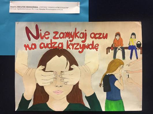 Uczennica naszej szkoły Alicja Świątek-Brzezińska zajęła II miejsce w konkursie plastycznym "Nie zamykaj oczu na przemoc". Nagrody zostały wręczone podczas konferencji "Powiat Wejherowski bez przemocy" w dniu 21 września w Zespole Szkół Ponadgimnazjalnych nr 1 w Wejherowie. Gratulujemy. |