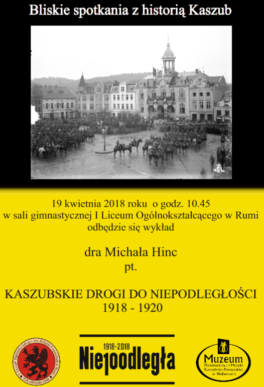 W czwartek, 19 kwietnia w naszej szkole odbył się wykład dr Michała Hinc z Muzeum Piśmiennictwa i Muzyki Kaszubsko-Pomorskiej w Wejherowie. W ramach rozpoczętych w zeszłym roku cyklu wykładów o historii najnowszej Kaszub uczniowie klas humanistycznych i językowych mieli okazję poznać "Kaszubskie drogi do Niepodległości w latach 1918-1920". |