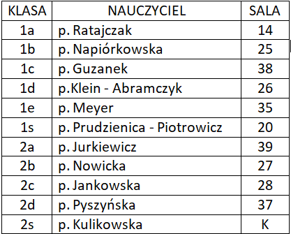 17.00 – spotkanie dyrekcji szkoły z rodzicami uczniów klas I, duża sala gimnastyczna 18.00 – spotkanie dyrekcji szkoły z rodzicami uczniów klas III, duża sala gimnastyczna 18.30 – spotkanie uczniów i rodziców przyjmujących gości z Niemiec, s.26 19.00 – spotkanie Rady Rodziców, sala K godz. 17.00 – spotkanie z dyrekcją w dużej sali gimnastycznej, a później z wychowawcą I a – Cecylia Ratajczak s.14 I b – Alicja Napiórkowska s.25 I c – Małgorzata Zych s.32 I d – Alicja Klein-Abramczyk s.26 I e – Maria Meyer s.35 I s – Aleksandra Prudzienica-Piotrowicz s.20 godz. 18.00 – spotkania z wychowawcą II a – Tomasz Jurkiewicz s.39 II b – Marta Nowicka s.27 II c – Agnieszka Jankowska s.15 II d – Magda Pyszyńska s.37 II s – Anna Kulikowska s.K godz. 18.00 – spotkanie z dyrekcją w dużej sali gimnastycznej, później z wychowawcą III a – Mirosława Pałubicka s.N III b – Monika Młynarczykowska s.38 III c – Anna Grudzińska s.40 III d – Elżbieta Rębiś s.28 III s – Ewa Domarus s.29 Serdecznie zapraszamy! |