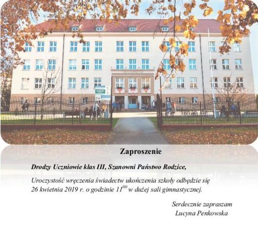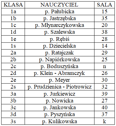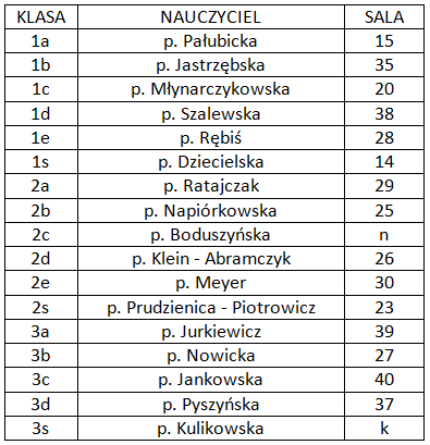 • W dniu 26 marca 2019 r. lekcje odbędą się wg planu B • W dniu 27 marca 2019 r. odbędą się spotkania z rodzicami: • Rodzice uczniów klas I, II – spotkania z wychowawcami o godz. 18.00 • Rodzice uczniów klas III – o godz. 17.00 - spotkanie w hali sportowej z dyrekcją szkoły – zostaną omówione procedury egzaminu maturalnego, następnie spotkania z wychowawcami klas • Wszyscy nauczyciele pełnią dyżur do godziny 19.45 • obowiązkowe spotkanie Rady Rodziców – o godz. 19.00 w Sali 15 KLASA WYCHOWAWCA SALA 1a p. M. Pałubicka Sala 15 (UWAGA! zebranie odbędzie się we wtorek 26.03.19 r. o godz.18.00) 1b p. A. Jastrzębska 35 1c p. M. Młynarczykowska 15 1d p. B. Szalewska 38 1e p. E. Rębiś 28 1s p. E. Dziecielska 14 2a p. C. Ratajczak 29 2b p. A. Napiórkowska 25 2c p. J. Boduszyńska n 2d p. Klein - Abramczyk 26 2e p. M. Meyer 32 2s p. A. Prudzienica - Piotrowicz 20 3a p. T. Jurkiewicz 39 3b p. M. Nowicka 27 3c p. A. Jankowska 40 3d p. M. Pyszyńska 37 3s p. A. Kulikowska k |