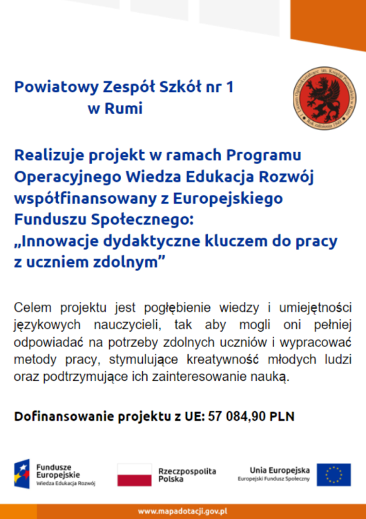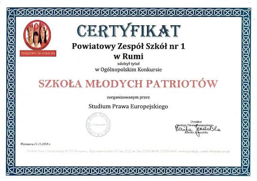 Od marca do listopada 2018 roku uczniowie i nauczyciele Powiatowego Zespołu Szkół nr 1 w Rumi uczestniczyli w Projekcie "Szkoła Młodych Patriotów". Organizatorem było Studium Prawa Europejskiego w Warszawie. Celem projektu było uświadomienie młodym ludziom, na czym polega współczesny i odpowiedzialny patriotyzm. Młodzież poprzez podejmowane działania szukała odpowiedzi na jakich wartościach dzisiaj, powinno się budować postawy patriotyczne. Wszystkie zadania były oceniane przez jury projektu na podstawie sprawozdań i protokołów konkursów wysyłanych do organizatorów. Za każde podjęte działanie uzyskaliśmy maksymalną ilość punktów. W nagrodę za 100% wykonanie zadań projektowych, otrzymaliśmy zaszczytny tytuł "Szkoły Młodych Patriotów". Warto również zaznaczyć, iż jest to bardzo duże wyróżnienie w Roku 100. Rocznicy Odzyskania przez Polskę Niepodległości. Dziękujemy wszystkim uczniom i nauczycielom za zaangażowanie i trud włożony w realizację zadań konkursowych. |