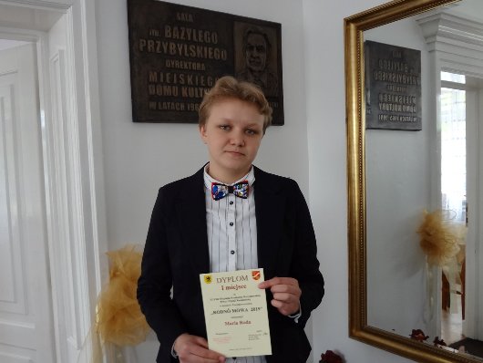 W dniu 9 maja 2019 roku, uczennica nasze szkoły - Maria Roda z klasy IIe , brała udział XLVIII Miejskim Konkursie Recytatorskim Prozy i Poezji Kaszubskiej „Rodnô Mòwa". Do konkursu Maria musiała przygotować dwa utwory: wiersz i prozę. Nasza uczennica wybrała wiersz Leona Heyke „Pòmòrsczi Grif”, oraz obszerny fragment utworu „Gôdczi wùje Léòna” Jerzego Hoppe, byłego Dyrektora naszego liceum. W konkursie tym Marysia zajęła I miejsce i tym samym, zakwalifikowała się do kolejnego etapu konkursu. Opiekunem merytorycznym uczennicy była pani Grażyna Górak. |