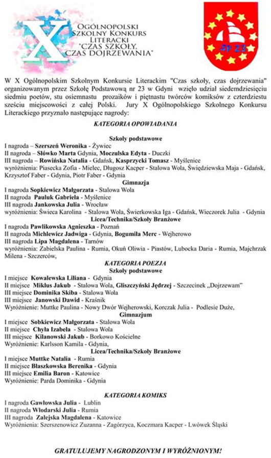 » I miejsce w X Ogólnopolskim Szkolnym Konkursie Literackim |