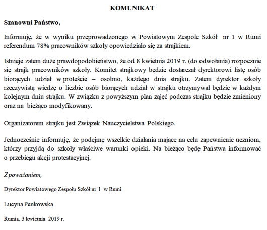 Szanowni Państwo, Drodzy Uczniowie, Uprzejmie informuję, że od 27 kwietnia 2019r. strajk nauczycieli w PZS nr 1 w Rumi został zawieszony. Zajęcia lekcyjne od 29 kwietnia 2019 r. będą odbywać się zgodnie z planem lekcji. Dziękuję Państwu za wyrozumiałość oraz wsparcie podczas akcji protestacyjnej. Z poważaniem |